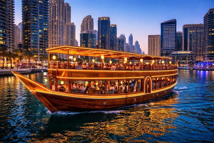 Dubai Marina Dhow Cruise: Dinner buffet and live show aboard a traditional boat with iconic