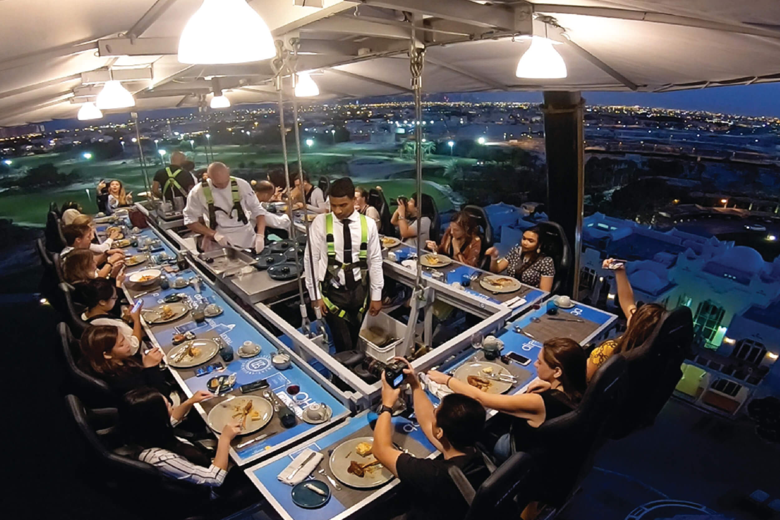 Sky-High Dining: A gourmet meal suspended 50m high with 360-degree views of Dubai’s iconic skyline.